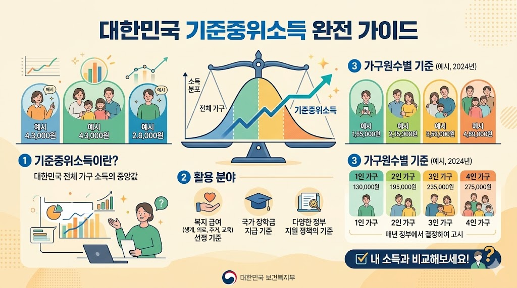 기준중위소득은 “우리나라 가구 소득을 줄 세웠을 때 딱 가운데”에 있는 값을, 정책용으로 가공해서 쓰는 숫자예요. 보건복지부 장관이 중앙생활보장위원회 심의·의결을 거쳐 고시하고, 국민기초생활보장제도 같은 여러 복지사업의 선정기준으로 넓게 쓰이고 있어요. 말이 어렵게 들려도 핵심은 간단해요. 어떤 제도든 “중위소득의 몇 % 이하” 같은 문구가 붙으면, 그 퍼센트 기준이 기준중위소득에서 출발한다는 거예요.